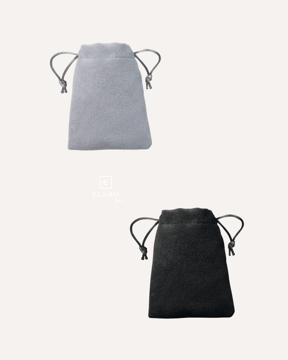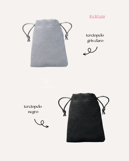 ⭐ Bolsita de antelina de suave acabado en color gris claro y negro. Con cierre de cinta a juego.