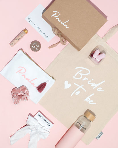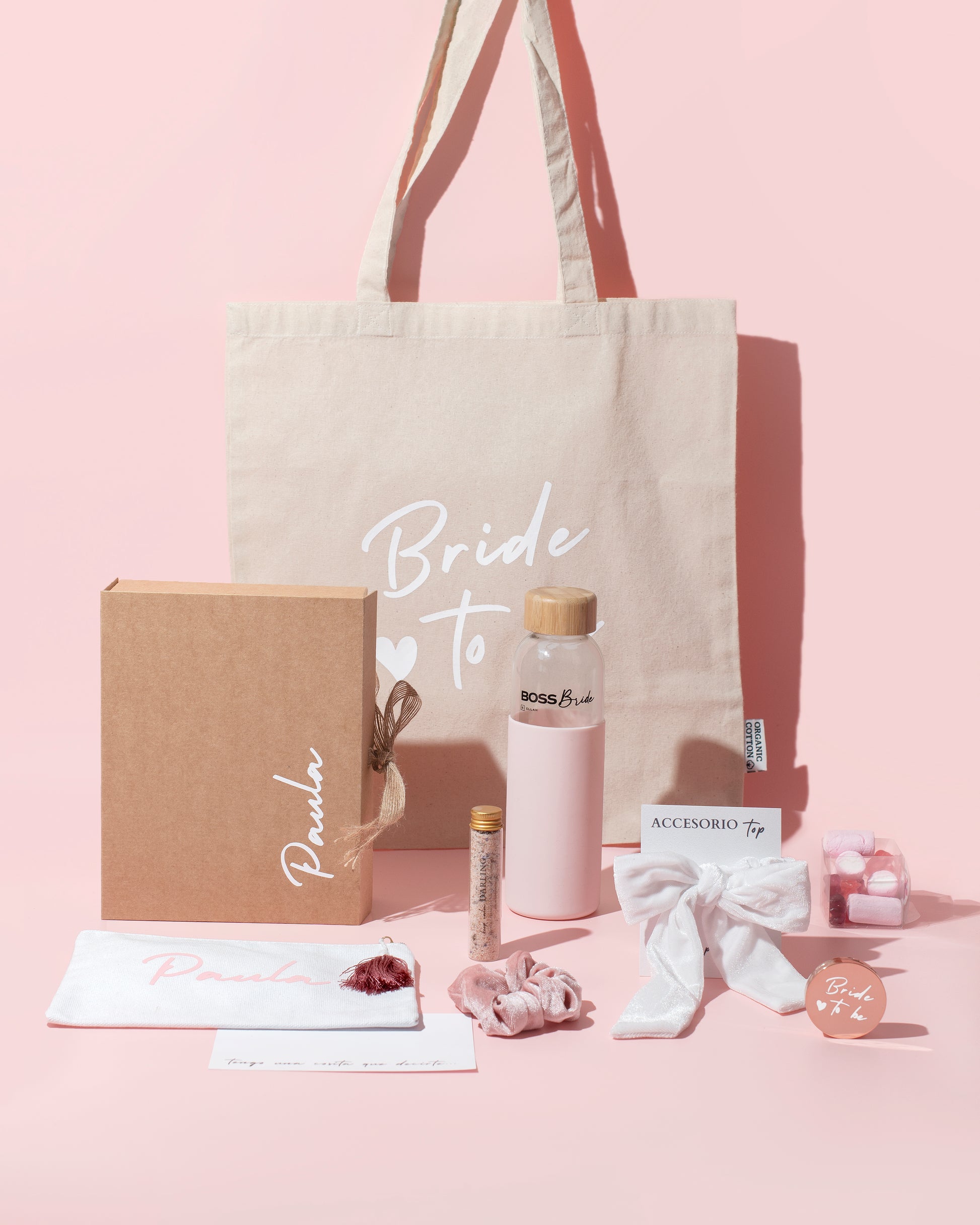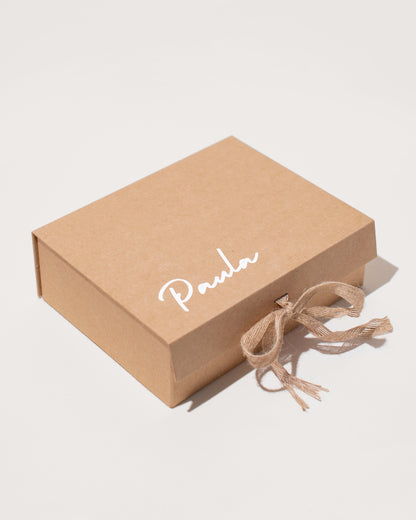 Todo perfectamente envuelto en una caja de regalo color kraft con un lazo y personalizada con el nombre de la novia.