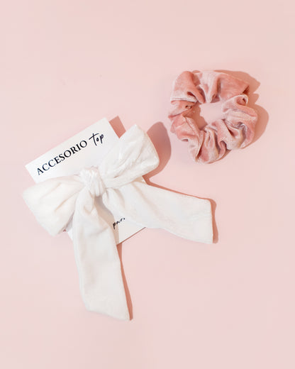🍭 Dos coleteros de terciopelo: uno sencillo y otro con un lazo. El coletero sencillo es de un suave rosa claro y el coletero con lazo es de un bonito blanco. Vienen presentados en un cartón perlado donde puedes escribir el nombre de la persona a quien se lo regalas.