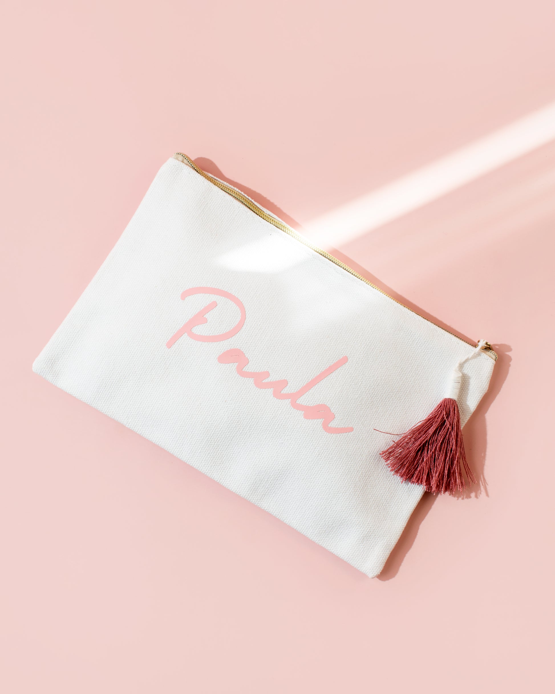 🍭 Un neceser personalizado con el nombre que nos indiques. Está hecho de algodón texturizado de color blanco y cierre de cremallera dorado con pompón rosa. Tamaño 20,5 x 14,5 cm. cm.