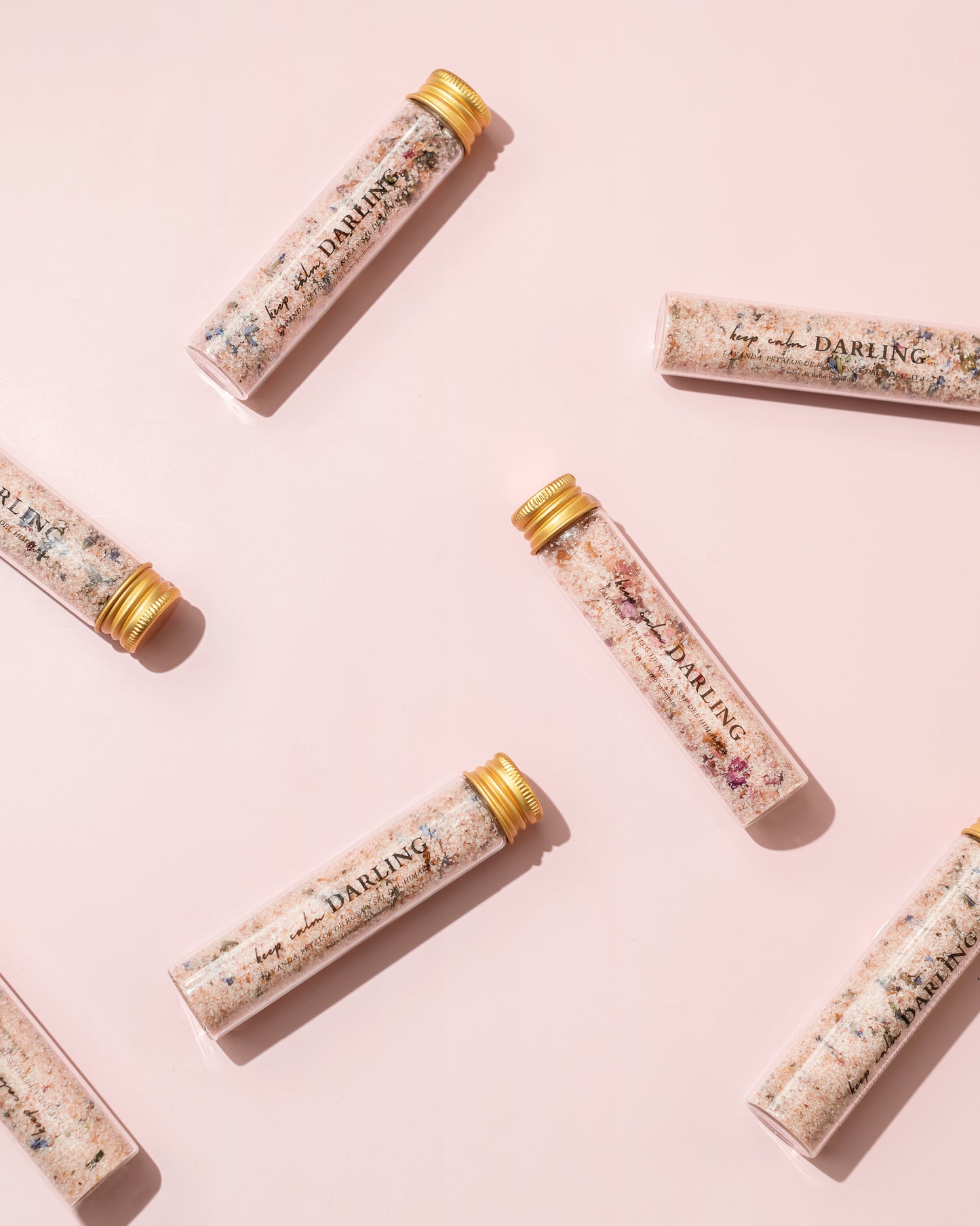 🍭 Un bote de sales premium con aceites esenciales de rosa y lavanda, pétalos de rosa y sal del Himalaya. Presentado en un elegante bote de tapa dorada, a conjunto con el resto de productos.