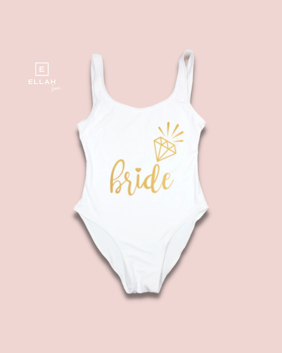 - Bañador para la novia | De color blanco, con la inscripción dorada "Bride"