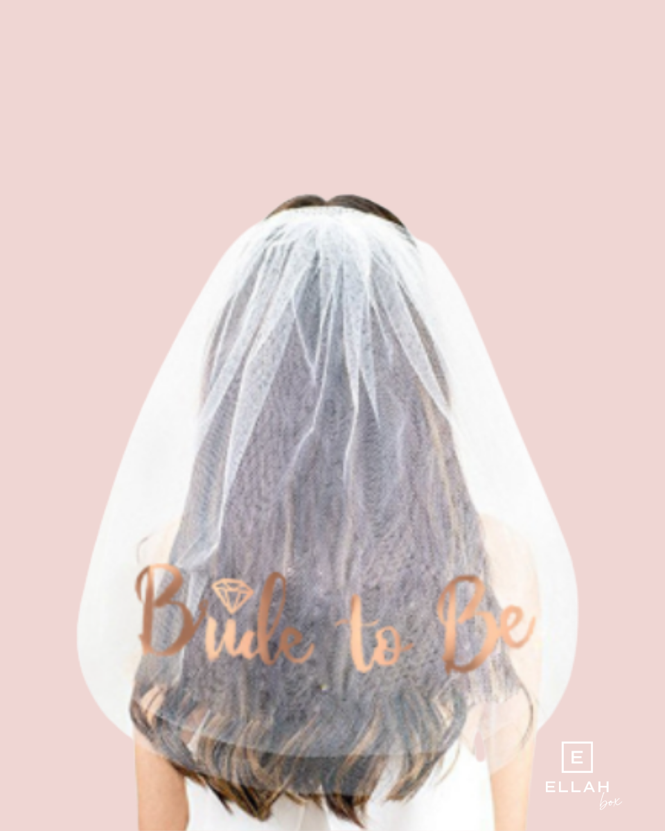 Tul blanco con la frase "bride to be" escrita en oro rosa.